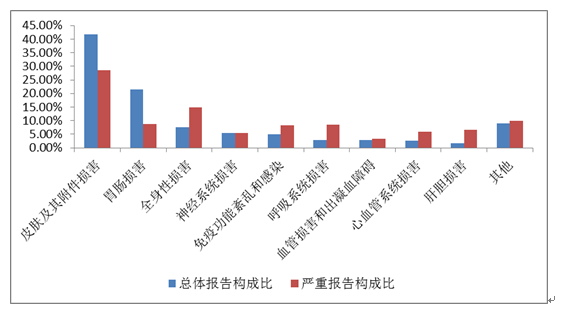 2019年國家基本藥物化學(xué)藥品和生物制品不良反應(yīng)/事件報告,按照藥品類別統(tǒng)計,報告數(shù)量排名前5位的分別是抗微生物藥、心血管系統(tǒng)用藥、抗腫瘤藥、激素及影響內(nèi)分泌藥、治療精神障礙藥;累及器官系統(tǒng)排名前5位的是皮膚及其附件損害、胃腸損害、全身性損害、神經(jīng)系統(tǒng)損害以及血液系統(tǒng)損害。